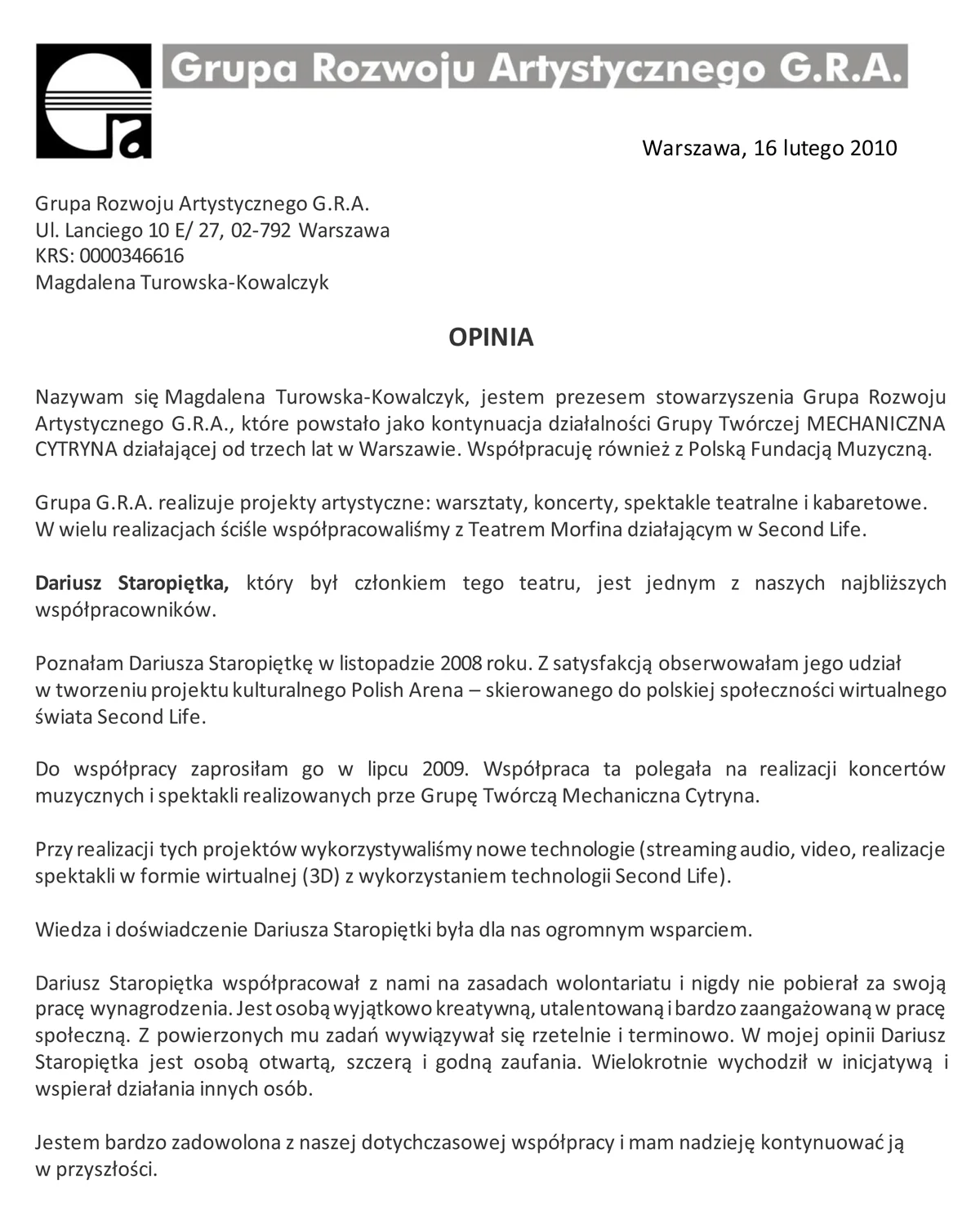 Kieruje stowarzyszeniem Grupa Rozwoju Artystycznego G.R.A., wspiera Polską Fundację Muzyczną, należy do grona Rady Artystycznej Studenckiego Festiwalu Piosenki w Krakowie.